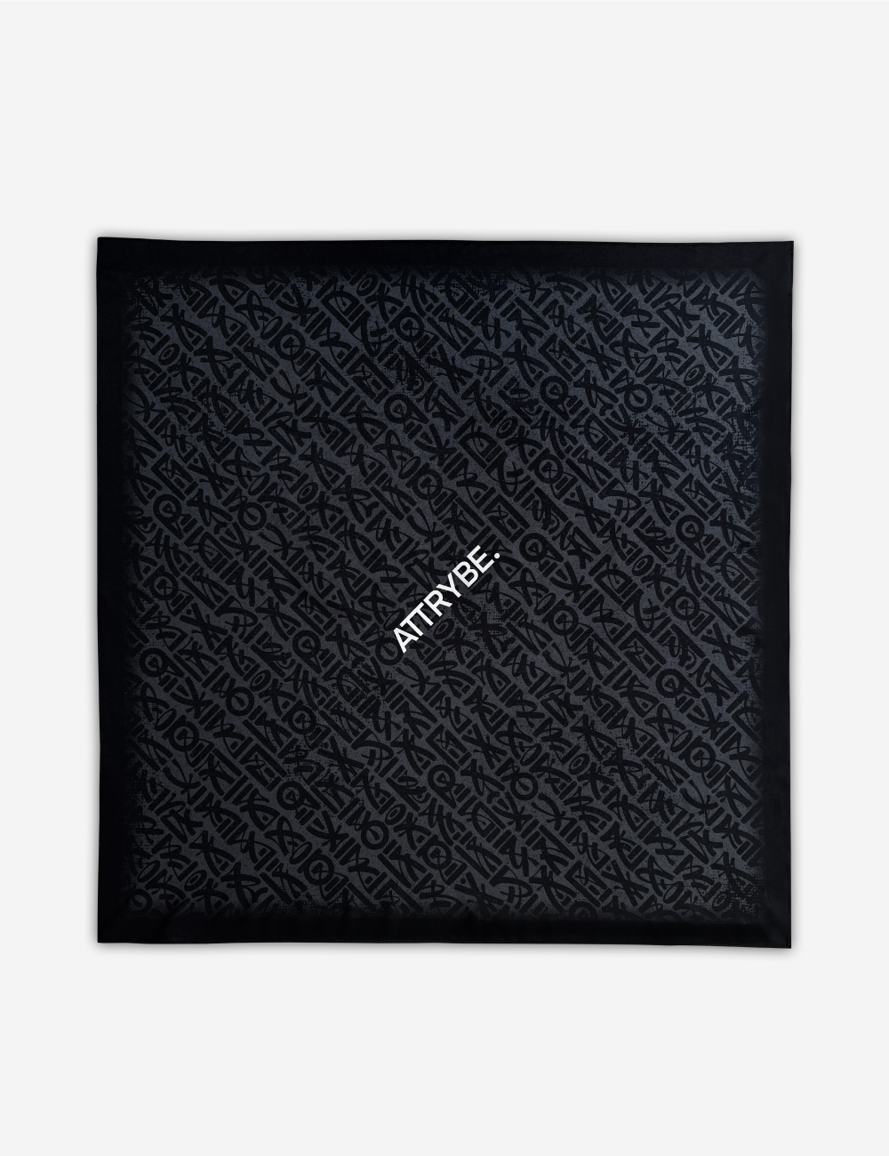 Pañoleta de seda negra con gráficos simbólicos inspirados en el lenguaje de nuestra Trybe.